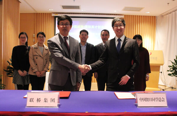 2017年3月5日,2017中國威?!H英才創(chuàng)業(yè)峰會海外博士(日本)威海行活動開幕。期間,聯(lián)橋集團(tuán)與中國留日同學(xué)總會簽訂了共建“中日高端人才交流平臺”合作協(xié)議。聯(lián)橋集團(tuán)董事、副總經(jīng)理于福杰與中國留日同學(xué)總會副秘書長劉恩璽代表雙方簽字。